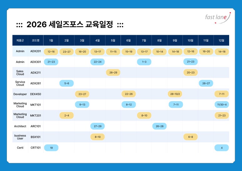 본 일정은 Admin, Developer, Architect, Sales/Service Cloud, Marketing Cloud, Business User, Certification 과정까지 주요 제품군 전체를 포함한 연간 공식 교육 일정입니다.