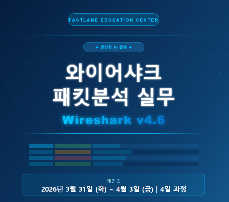 네트워크 보안과 성능 최적화의 핵심 도구, 와이어샤크(Wireshark)를 제대로 배울 수 있는 기회가 왔습니다! 패스트레인 교육센터가 2026년 봄, 최신 버전 Wireshark v4.6을 기반으로 한 실무 중심의 패킷 분석 전문 과정을 개설합니다.